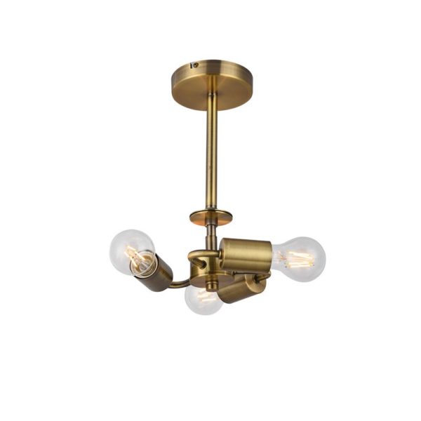 Our 3 light semi flush ceiling fitting featuring a circular ceiling plate with central rod all in antique brass finish with 3 lamp holders.