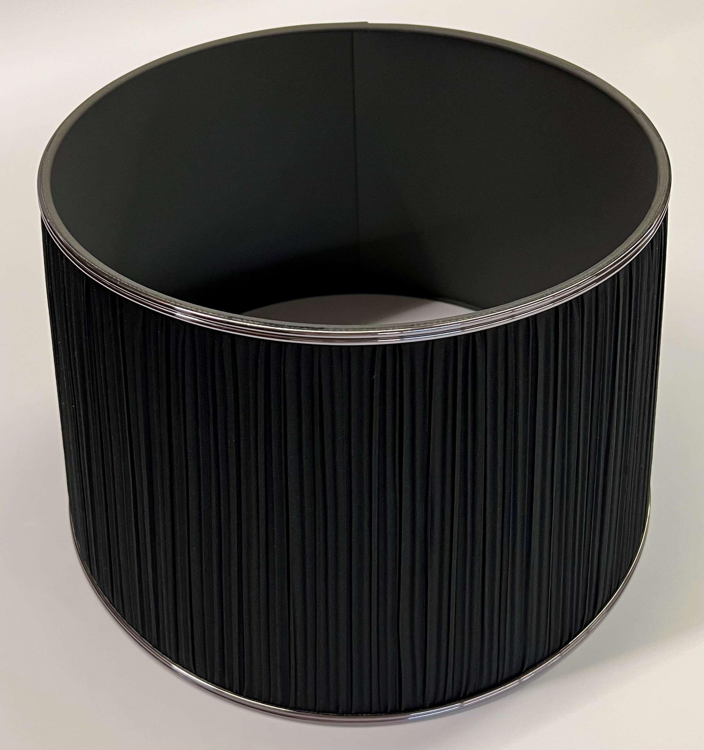 With a black silk pleat lined with a charcoal interior and finished with a pewter metallic trim this statement lampshade just oozies class.