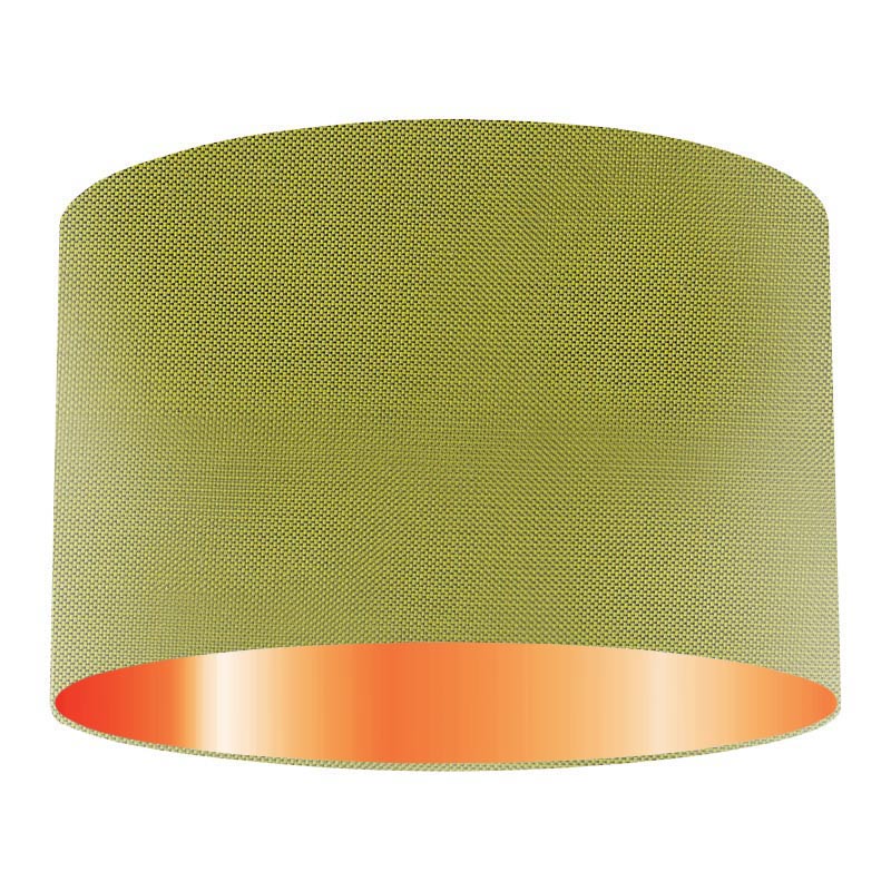 A beautiful green Kiwi silk drum lampshade with rose Copper lining suitable for both table lampshade and pendant/ceiling lampshade. Handmade in the UK. Fits all ES and BC lamp holders. Max 60W bulb or Low Energy Equivalent.