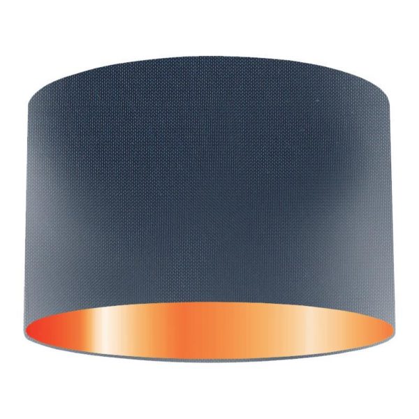A beautiful blue Wihelm silk drum lampshade with rose Copper lining suitable for both table lampshade and pendant/ceiling lampshade. Handmade in the UK. Fits all ES and BC lamp holders. Max 60W bulb or Low Energy Equivalent.